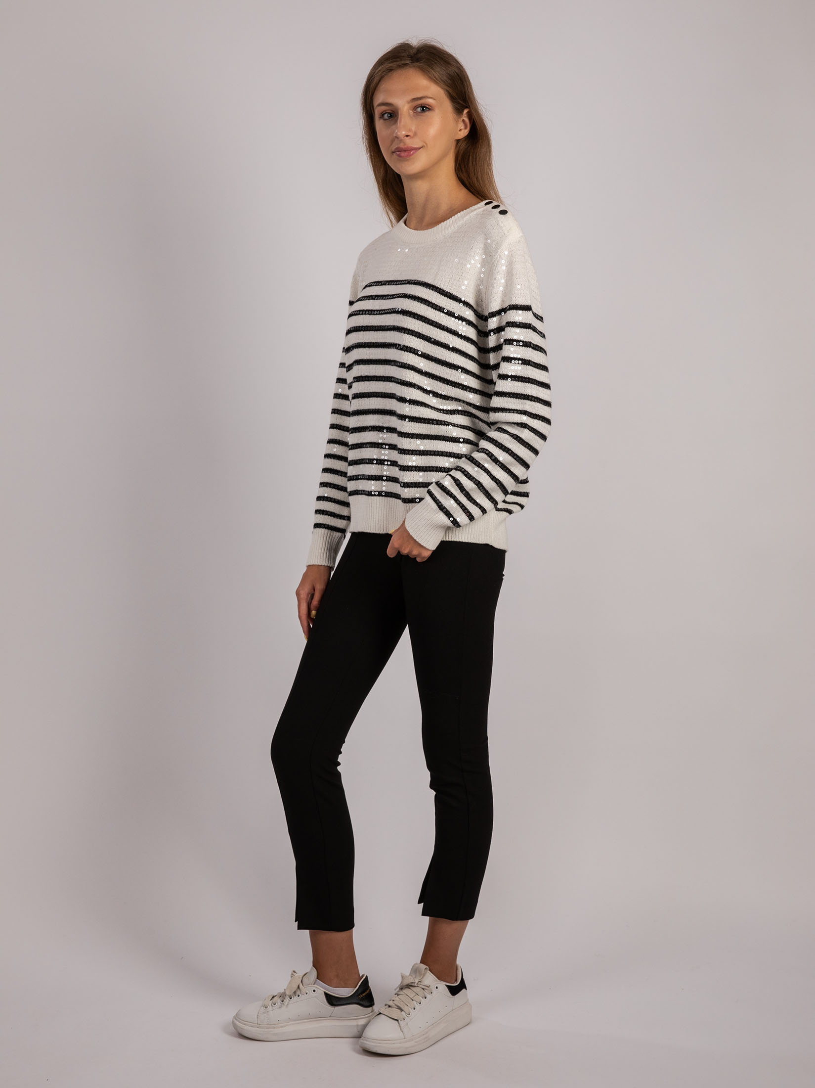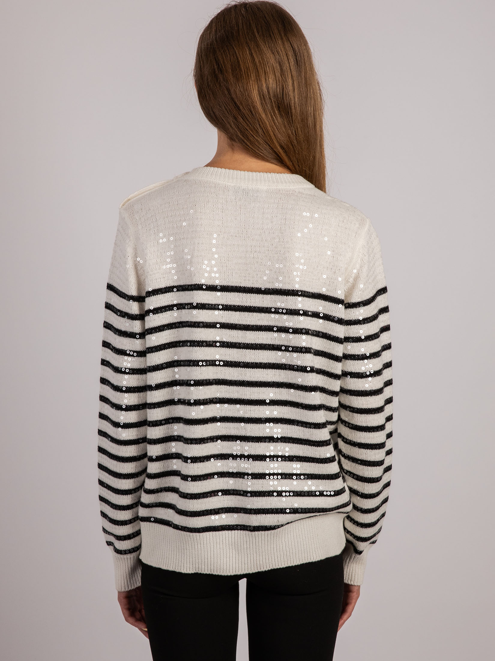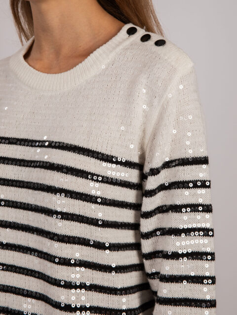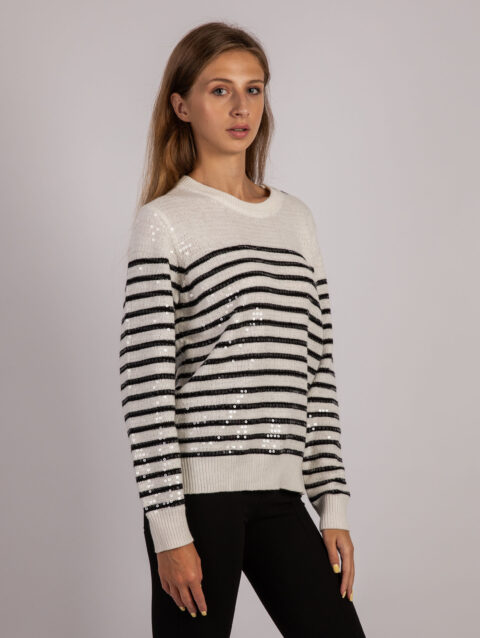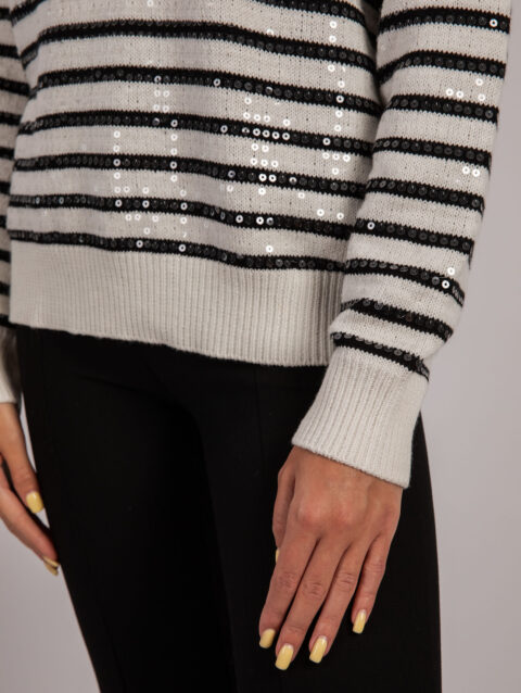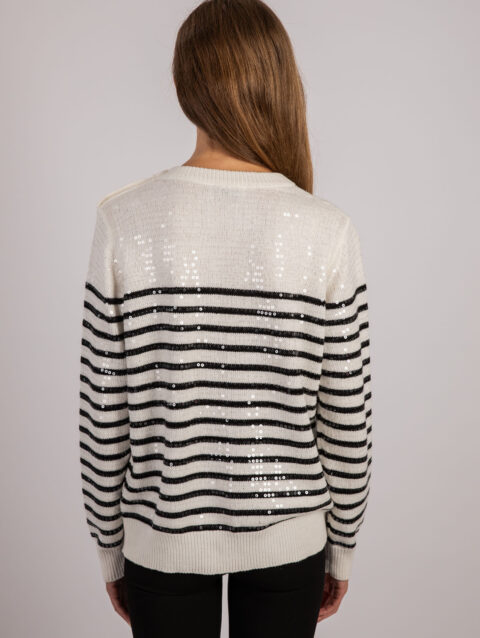 • Schwarz-weißer Pullover mit Streifen und Pailletten allover