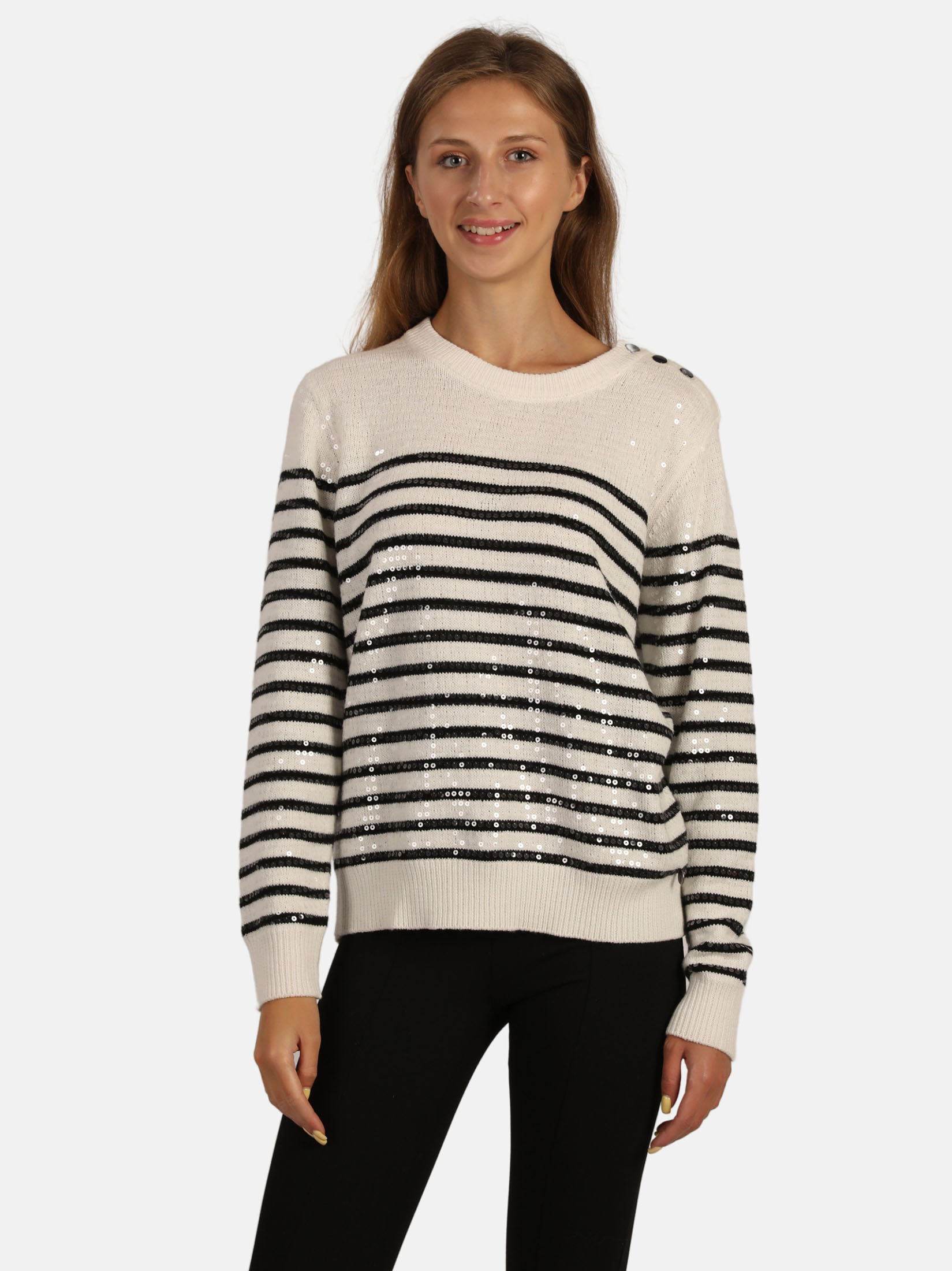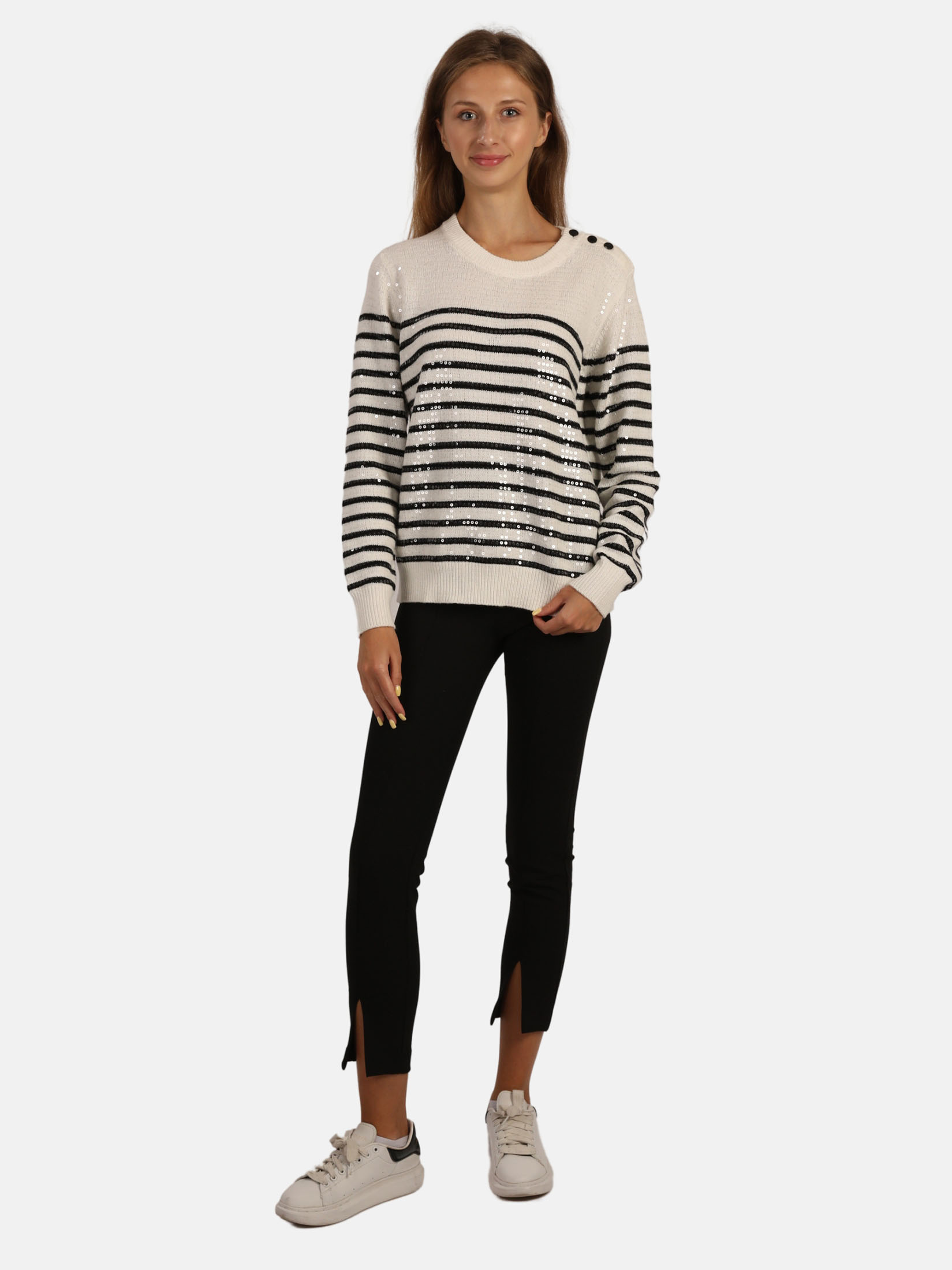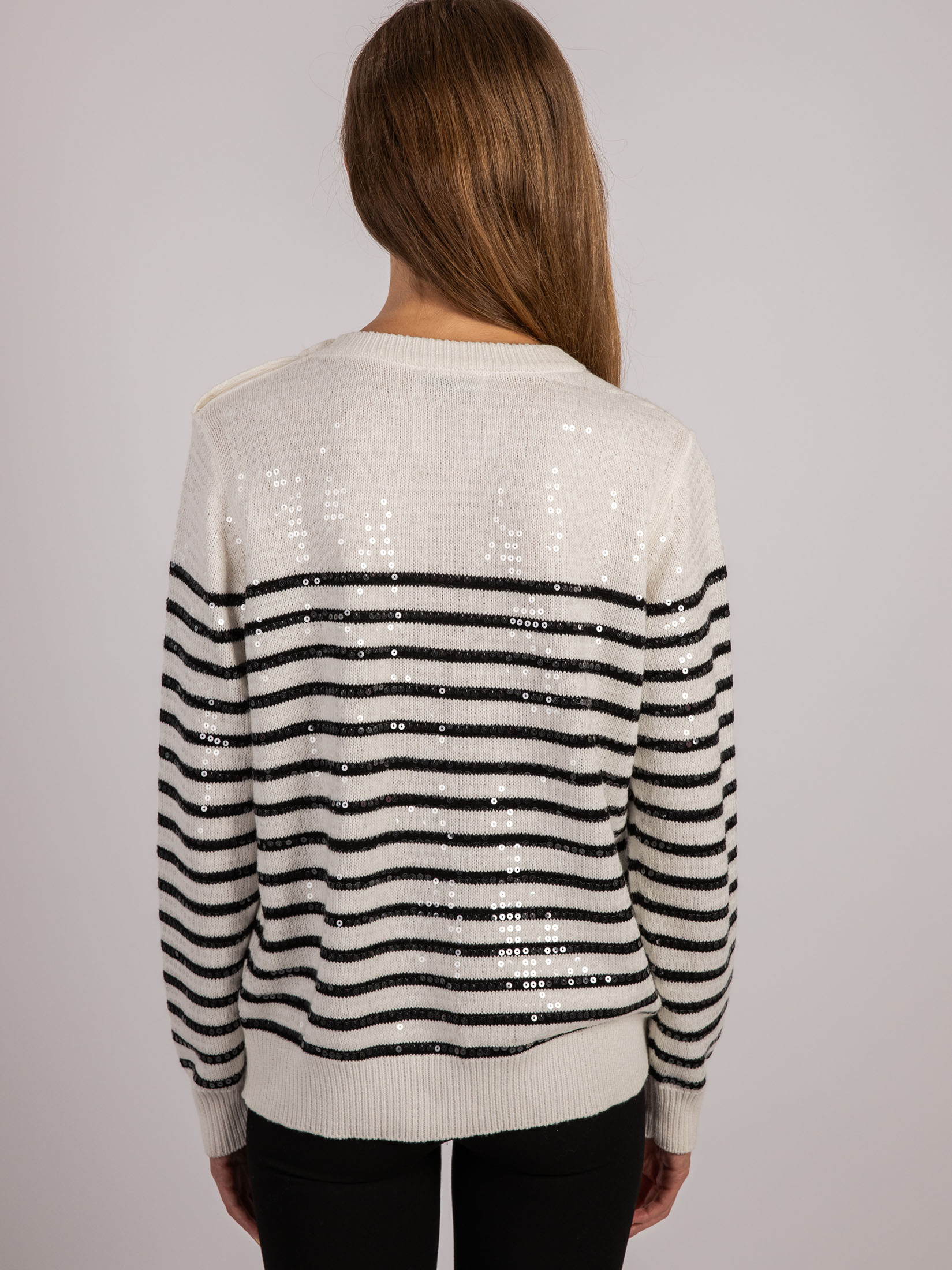 • Schwarz-weißer Pullover mit Streifen und Pailletten allover